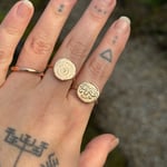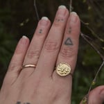 Ready to ship, ring size N. Made from solid recycled 9ct gold. Full UK hallmarks on the back of the ring by the Sheffield Assay Office. The hammered band is 2mm wide. Weights a total of 4.3g.