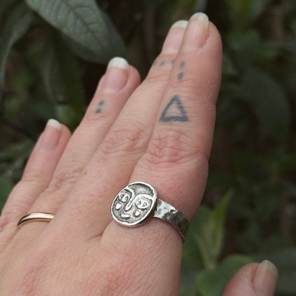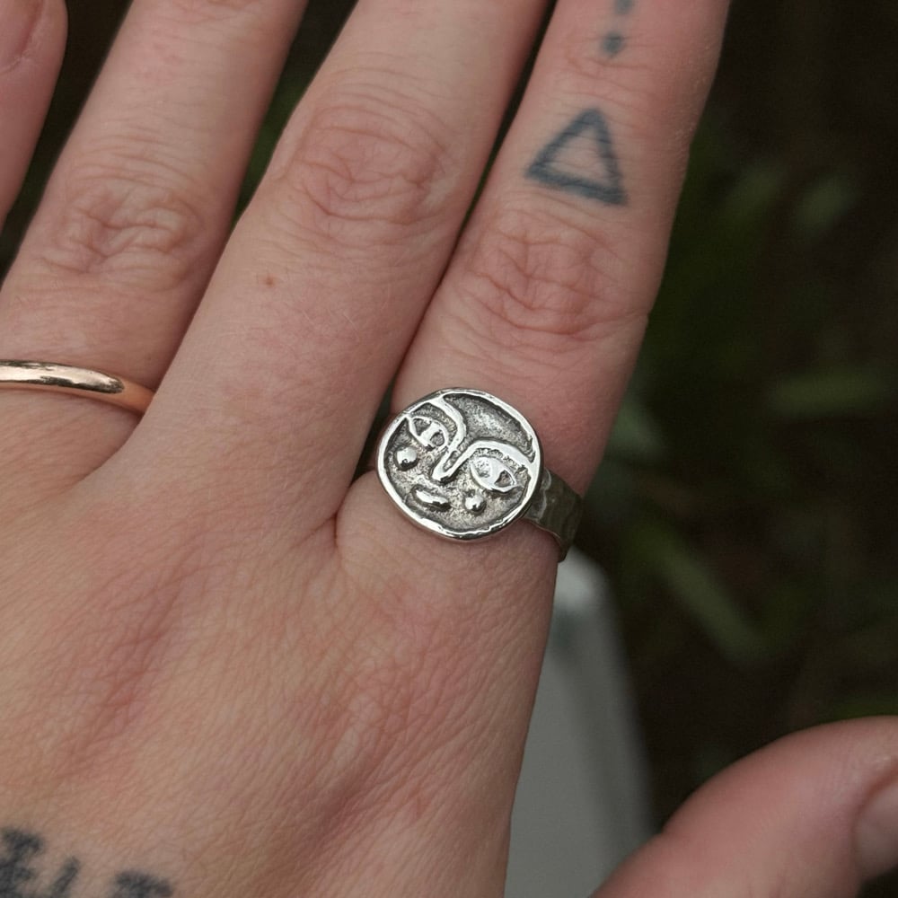 One of a kind recycled sterling silver moon face ring, oxidised to bring out the detail. Weighs 3.8g, stamped 925.